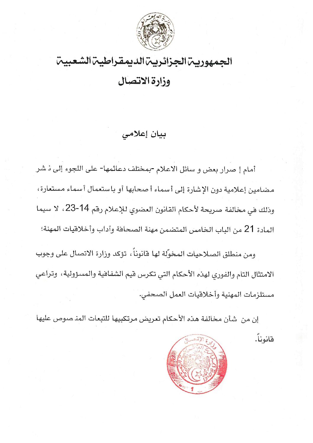 شدّدت وزارة الاتصال على ضرورة التزام وسائل الإعلام الوطنية، بمختلف دعائمها، بأحكام القانون العضوي للإعلام، وعدم الإستمرار في نشر مضامين إعلامية دون الإشارة إلى هوية أصحابها أو باللجوء إلى أسماء مستعارة.